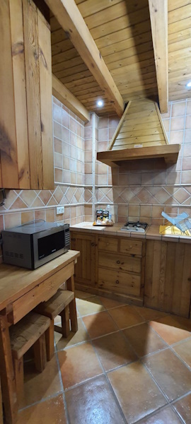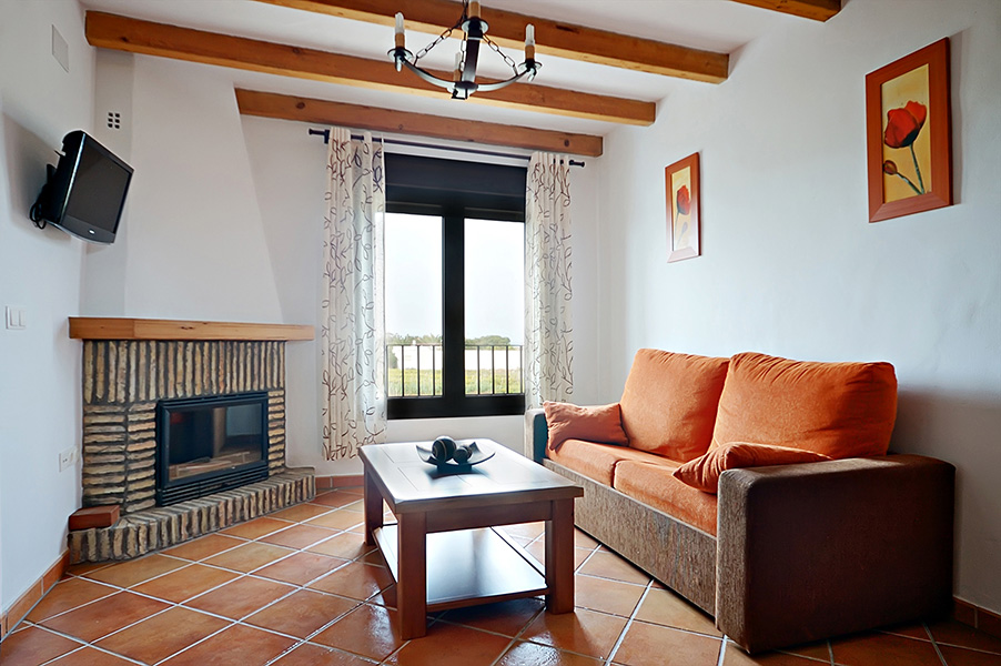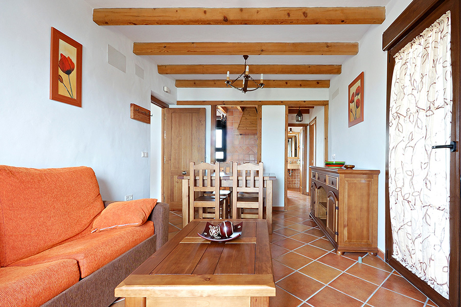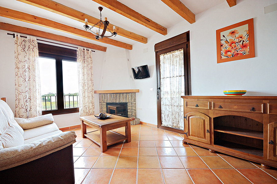 Una habitación con dos camas individuales y sofá cama doble en el salón. Ideales para familias con niños. Además cuenta con cocina totalmente equipada, salón-comedor, terraza y chimenea.